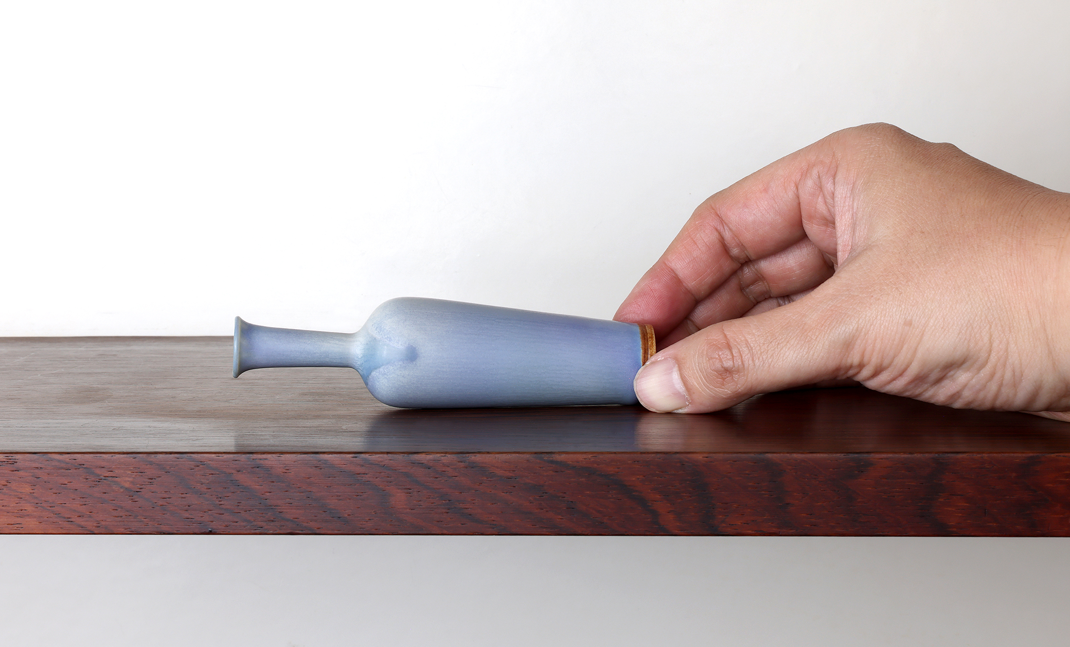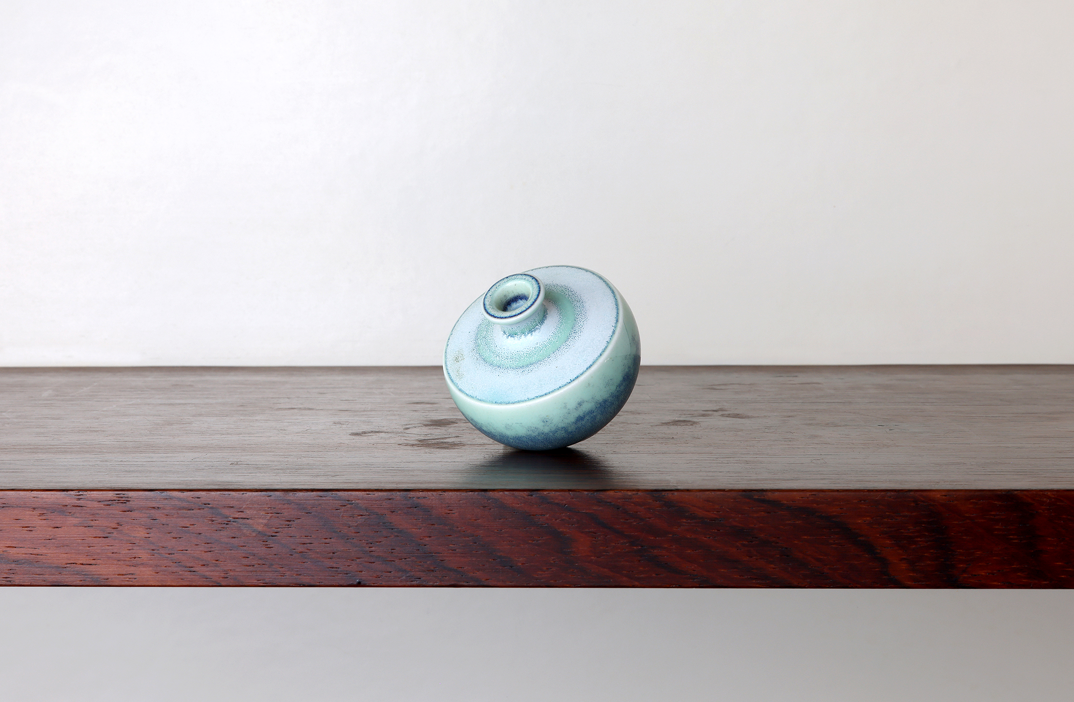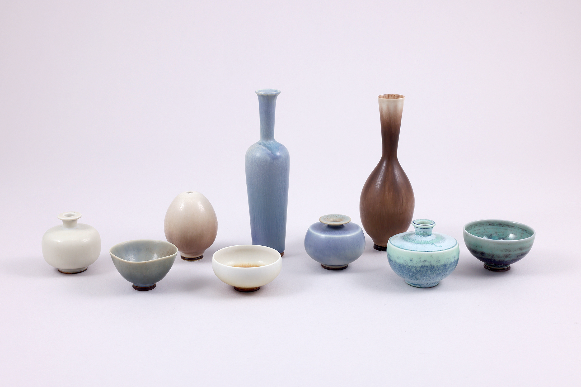 ベルント・フリーベリの淡い色味の釉作品たちです。釉を水の様にサラサラと淡くすることで、どうやら表情が水彩画の様に現れる様で、それは赤茶から黒茶、青磁や瑠璃釉など全てに存在しております。上から透明釉を施釉するタイプのものも、独特の軽やかな表情が現れ、見どころ満載です。