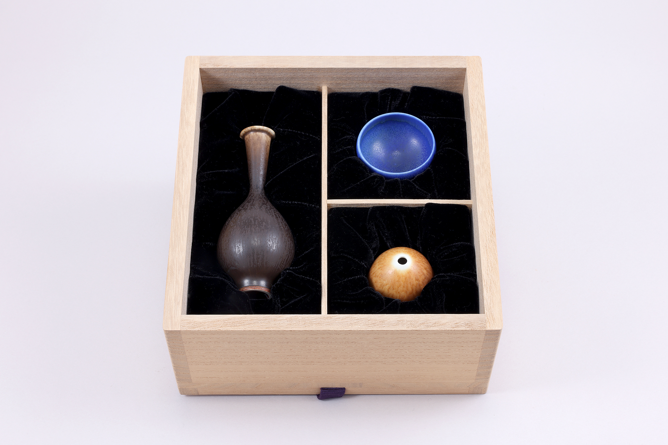 ベルント・フリーベリのミニチュアセット箱です。この3点はどれも隙のない完璧なフォルムと釉薬の作品たちで、この組み合わせがあれば、フリーベリの美しさをご存分に感じていただける作品を選んでおります。その他ご予算やご要望にて、アレンジも承りますので、お申し付けくださいませ。