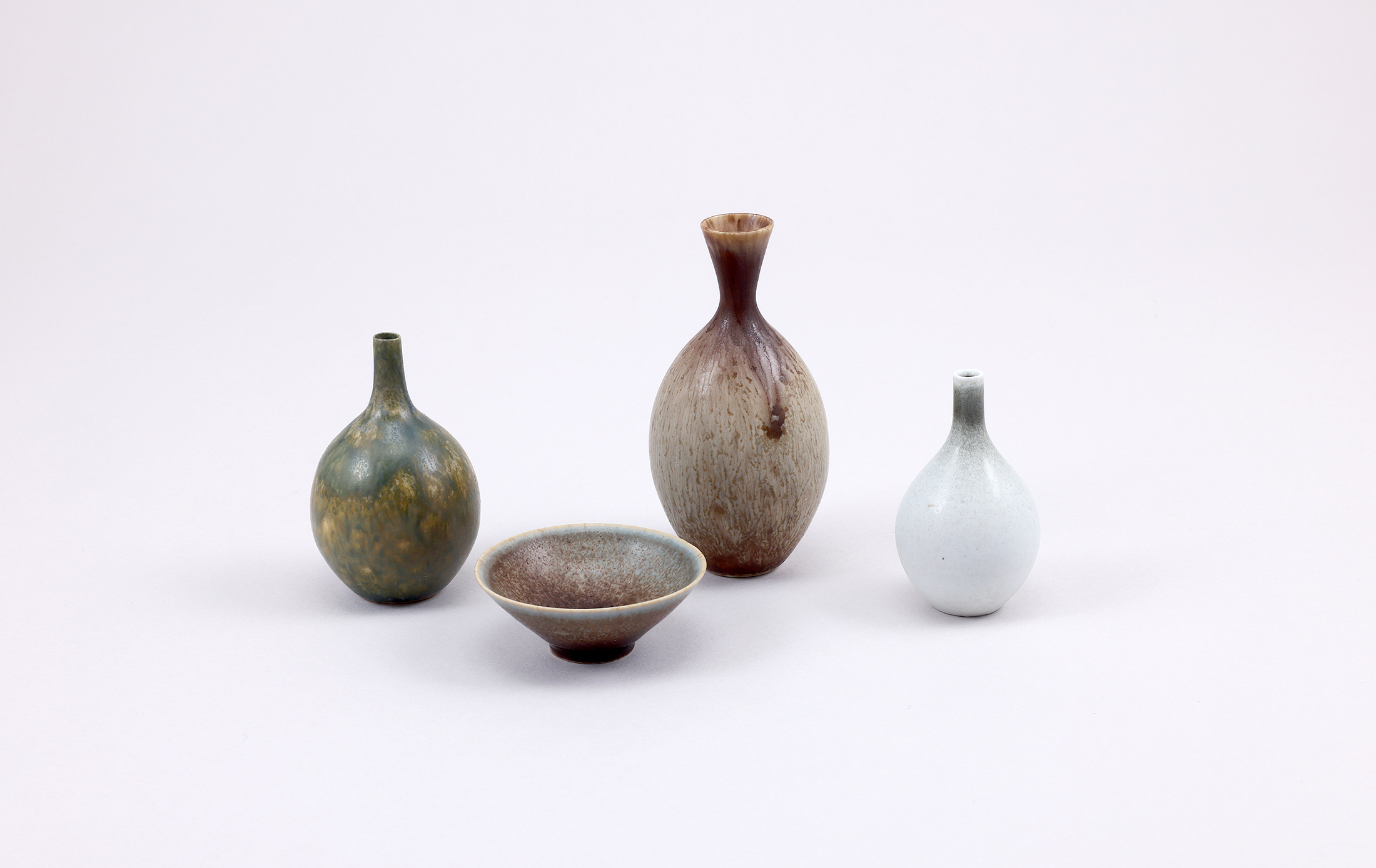 スティグ・リンドベリの轆轤師として活躍したスヴェン・ヴァイスフェルトのミニチュア作品です。元々は、ロールストランドでグナー・ニールンドの下で轆轤師として活躍しましたが、1953年よりグスタフスベリ製陶所で、リンドベリの下で働き始め、1977年にはグスタフスベリに自身のスタジオを設立して作品を2008年まで制作しております。よく考えると、ニールンドの薄い鉢作品やリンドベリの陶芸作品など、彼が制作している事が多く、共通の曲線や釉の表情を感じさせます。フリーベリには無い、独特のフォルムと釉の表情は、まさにユニーク(唯一無二)な感覚があります。ヴァイスフェルト作品は、今回の期間中のみ特別価格でのご紹介です。