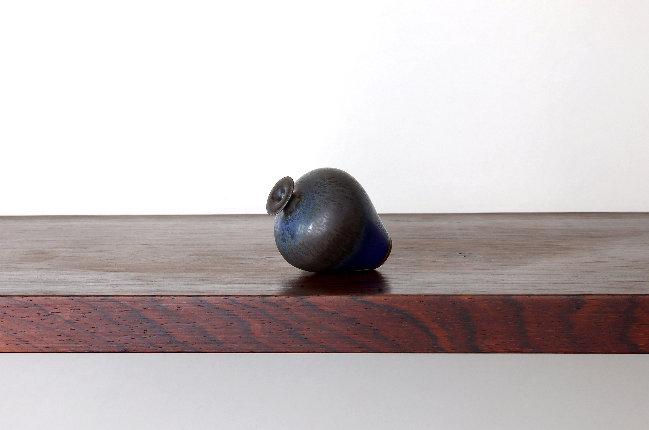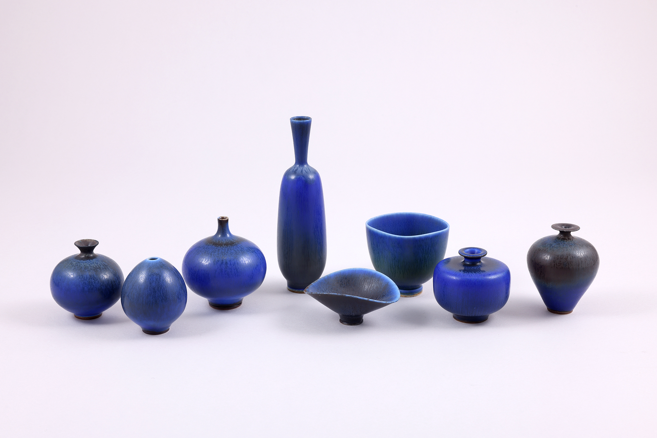 ベルント・フリーベリの瑠璃釉シリーズたちです。どれも濃く深い青が美しく、表情や形も秀逸です。瑠璃釉の基本には、コバルトのブルーの釉が掛けられ、その上から茶釉が二重掛けされるのが定番ですが、茶釉の代わりに上から緑釉を掛ける作品も時より存在しております。