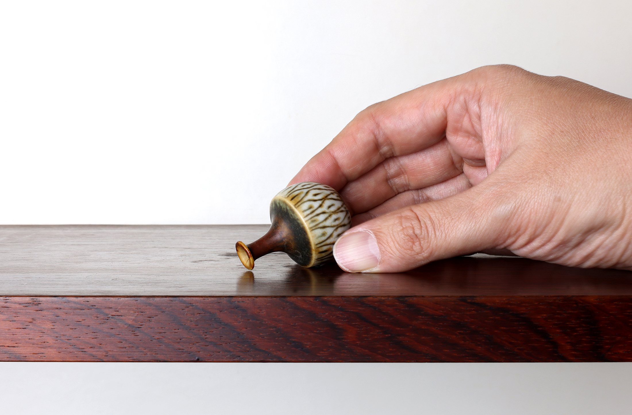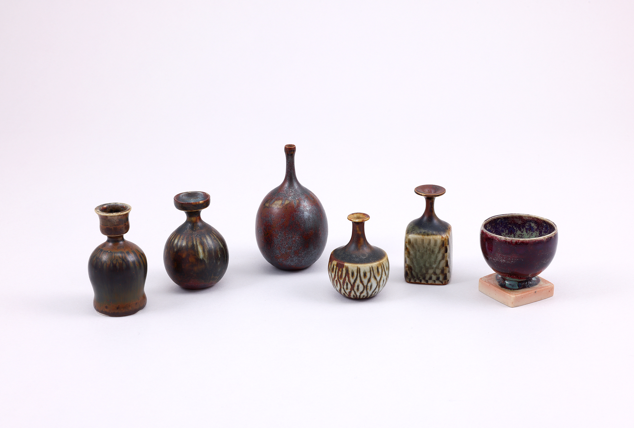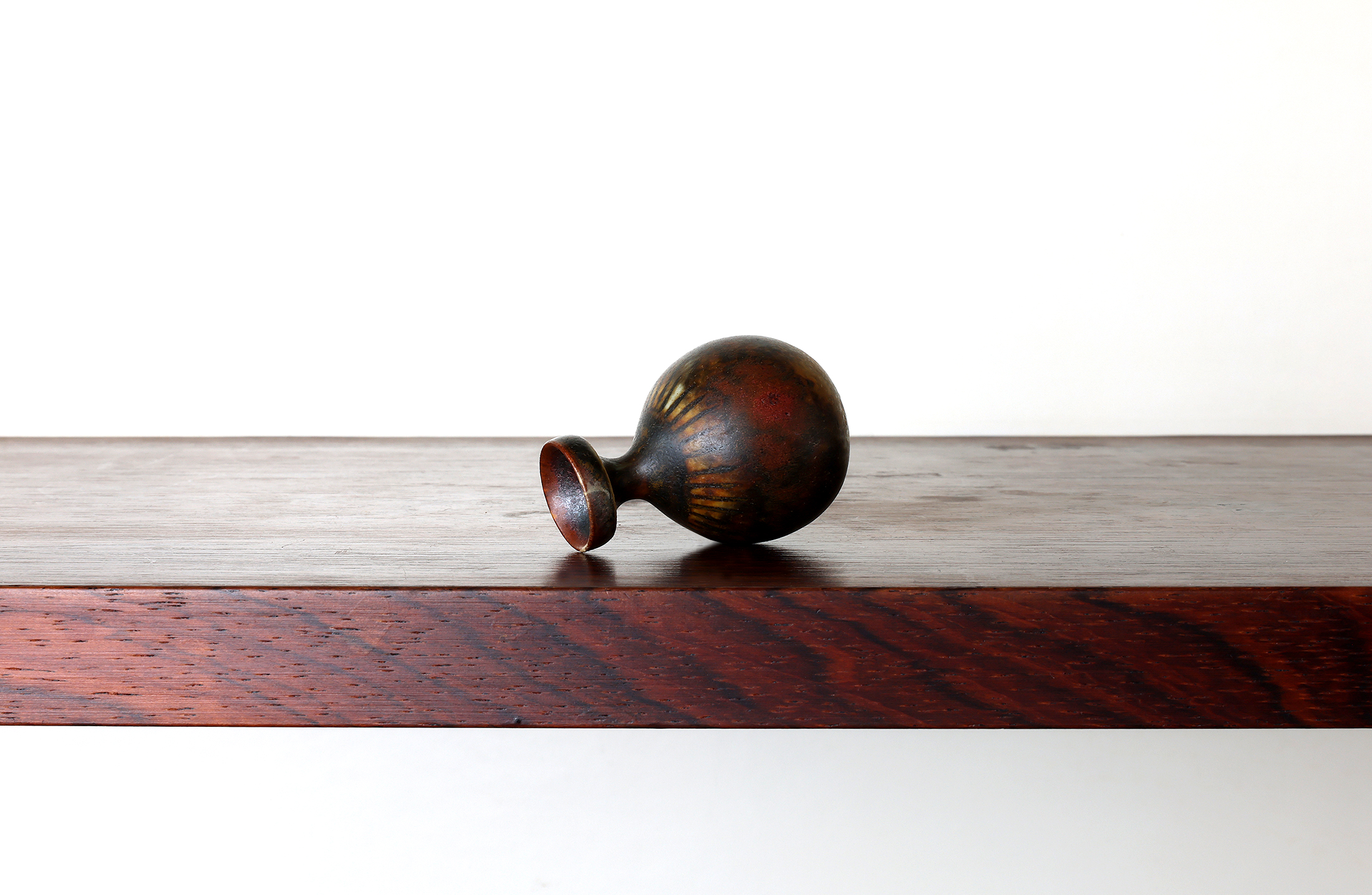 スティグ・リンドベリのミニチュア作品たちです。制作年代は様々ですが、50〜60年代を中心にスヴェン・ヴァイスフェルトが轆轤師として制作をしていると思われます。師匠のヴィルヘルム・コーゲには無い文様、同僚のベルント・フリーベリには無い、フォルムと釉の色を、彼独自に再現している所が素晴らしい作品群です。台付の碗は、本来テストピースで制作したと思われますが、それにサインを入れて作品として出す所が、リンドベリのセンスのずば抜けた部分と思います。